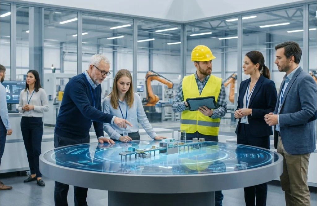 Students test decisions in a risk-free environment before touching production lines, aligning with future digital twins.